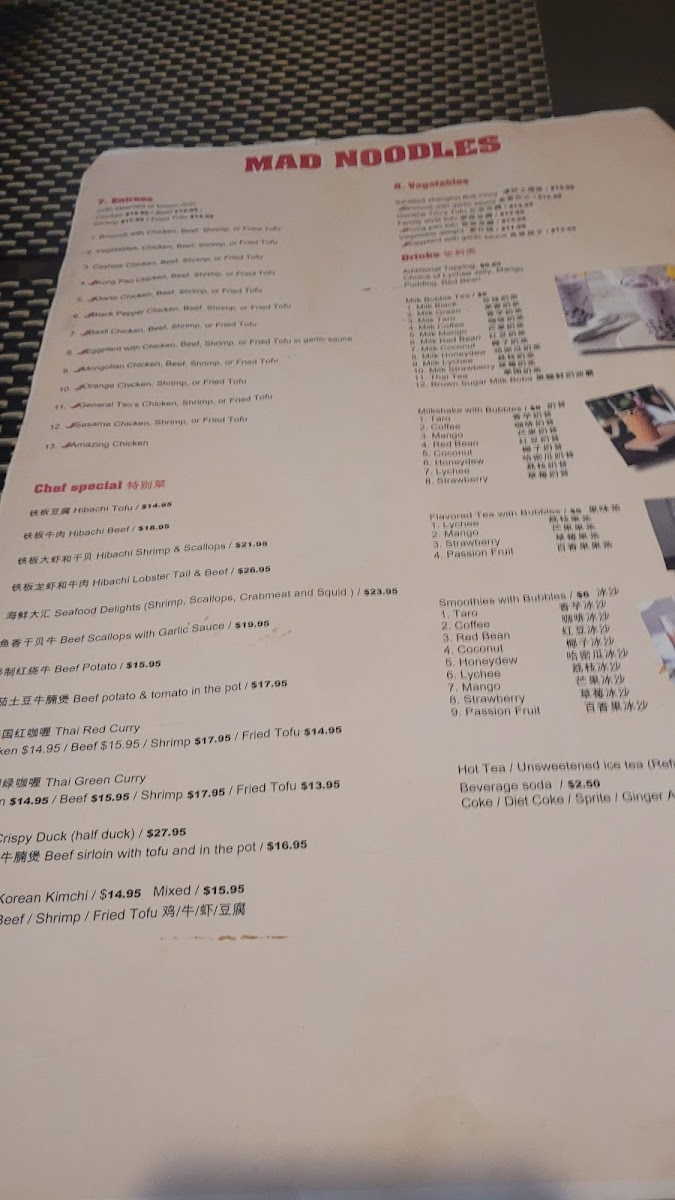 Welcome to Mad Noodles, nestled in the heart of Pittsburgh at 2017 E Carson St. This vibrant eatery offers a captivating menu brimming with bold flavors and textures. The standout items include their Hibachi Tofu, perfectly grilled to deliver that smoky flavor, and the Seafood Delight, featuring a medley of shrimp, scallops, crabmeat, and squid. For spice enthusiasts, the Kung Pao Entree offers a delightful explosion of heat with fresh veggies and peanuts.